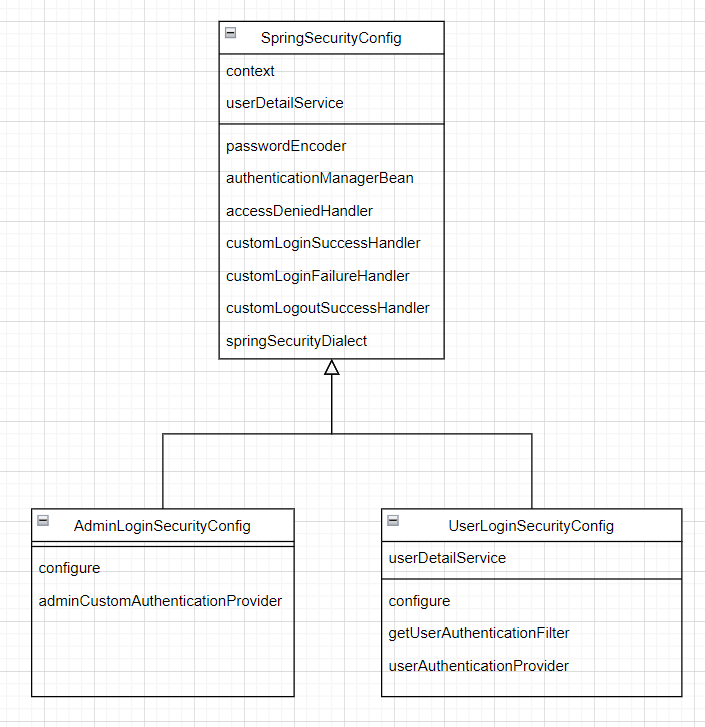 우선 공통으로 사용될 SpringSecurityConfig를 작성하고, UserLoginSecurityConfig와 AdminLoginSecurityConfig에서 SpringSecurityConfig를 상속받아 정의합니다.
