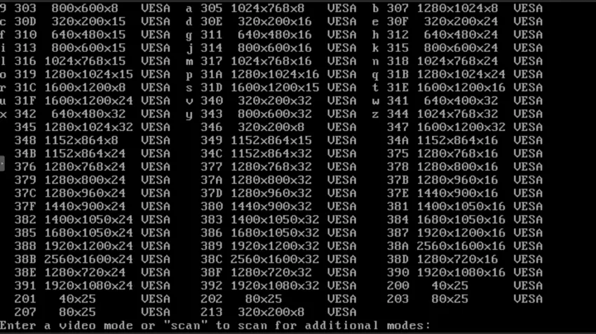video mode로 진입하게 되면, 선택할 수 있는 해상도의 옵션이 출력되는데, 해상도 왼쪽에 있는 3자리 숫자는 해당 해상도를 가리키는 HEX 키입니다.