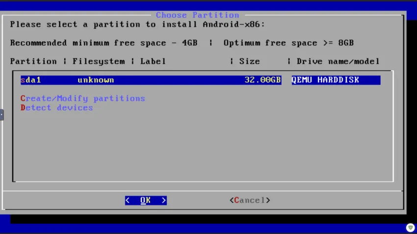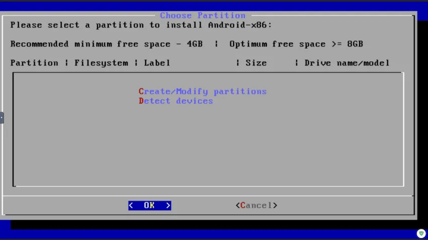 최초설치로 인해 파티션이 없으므로 첫 번째 Create... partitions를 선택합니다.