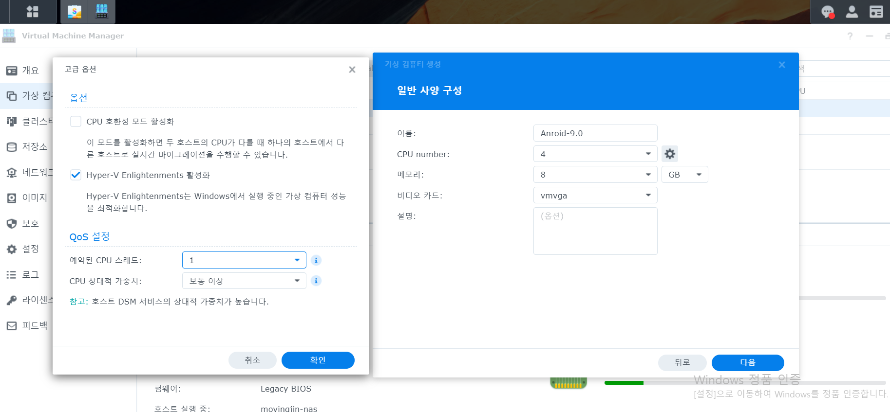 톱니바퀴를 눌러 Hyper-V Enlightenments 활성화를 체크해 주시고, 예약된 CPU를 하나 두고 가중치를 보통이상으로 둡니다.