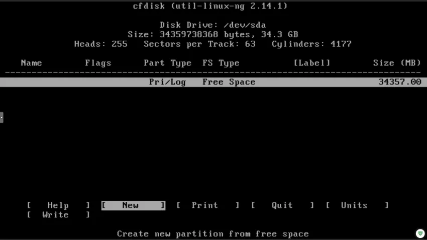 총 32기가가 할당된 것을 볼 수 있고, 파티션을 만들어야 하기 때문에 좌측하단에 "New"를 선택합니다.