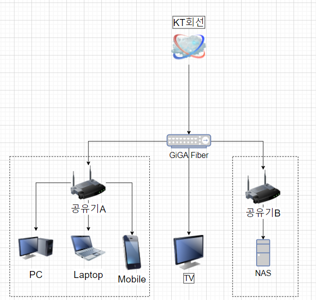 그래서 거실에 설치된 GiGA fiber 광모뎀으로부터 회선을 하나 따서 새로운 공유기로 NAS 전용 망을 구성했습니다.