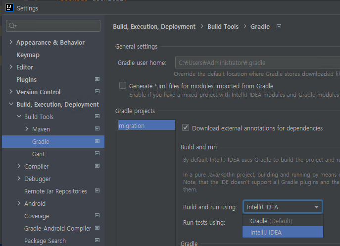 일반적으로 IntelliJ에서 프로젝트를 실행하면 Build와 Run을 Gradle을 통해서 실행합니다.