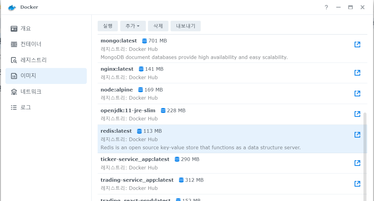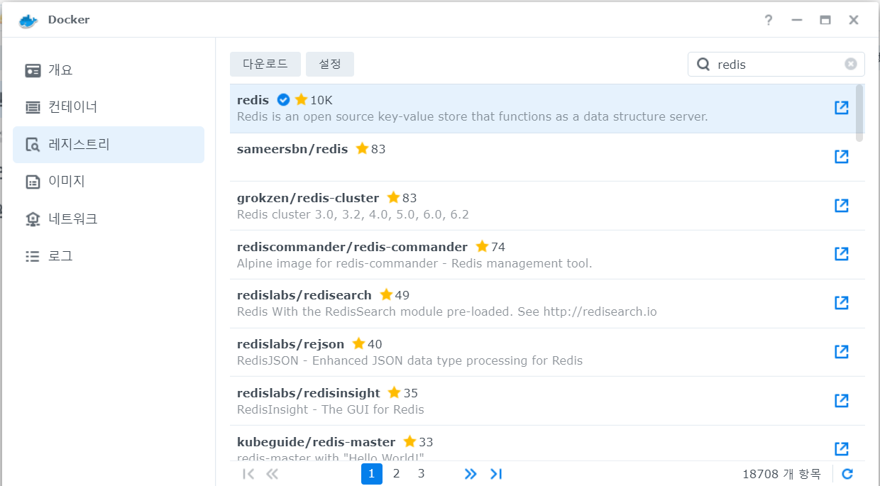Docker패키지->레지스트리에서 redis 공식 이미지를 다운로드합니다.
